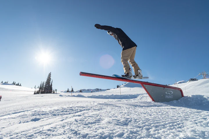 7. **Dismount:** As your snowboard reaches the end of the rail or box, shift your weight back and ollie off the feature to land smoothly on the snow.