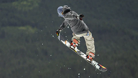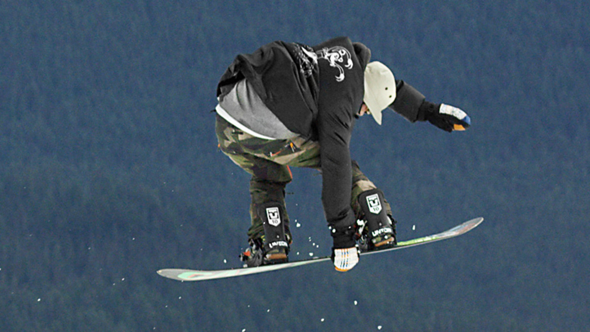 3. **Launch:** Spring off the lip of the jump with power and confidence. As you leave the ground, extend your trailing hand back and reach for the heel edge of the snowboard between the bindings.